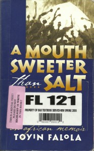 Orlando! Stuck in a resort that celebrates anti-intellectualism, I thanked the gods of my ancestors that I took a book with me, A Mouth Sweeter than Salt: An African Memoir by Professor Toyin Falola. I bought the book a while back because this pretty spirit loitering around the watering holes of the new world without walls, that coven without wires called the Internet, asked me to read the book.  I don’t know her name; her pseudonym is an avatar, but she is a spiritual sister brimming with soul and intelligence and the other day she asked me: Have you read Toyin Falola’s A Mouth Sweeter than Salt? And I bought the book, meaning to read it sometime, but my life is crazy, there are only so many books you can read in a lifetime. And so it sat on my coffee table, waiting for my daughter Ominira to pick it up and read. On my way out to the airport, spying the book on my coffee table, I swiped it and shoved it into my reading bag.