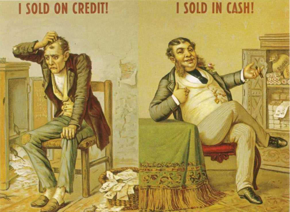 Cash had a framed picture in his store that showed two men. In one half of the picture, the man who sold in cash was smiling and looking prosperous in a green jacket and a fine waistcoat with a gold watch dangling from a chain and gold coins all around him. The other man who sold on credit was dressed in rags and looked haggard. All around him were the signs of his poverty; a rat nibbled at a piece of dry cheese in a corner of the store. (p 28)